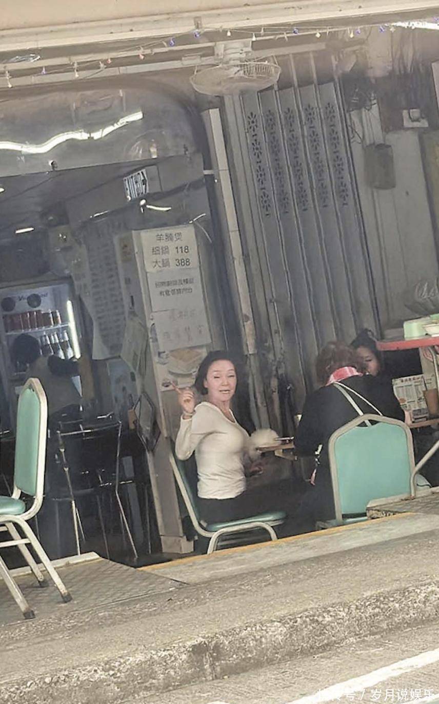 张柏芝母亲戴莎妮罕露脸,在街边茶档喝茶聊天,怀抱爱犬生活惬意